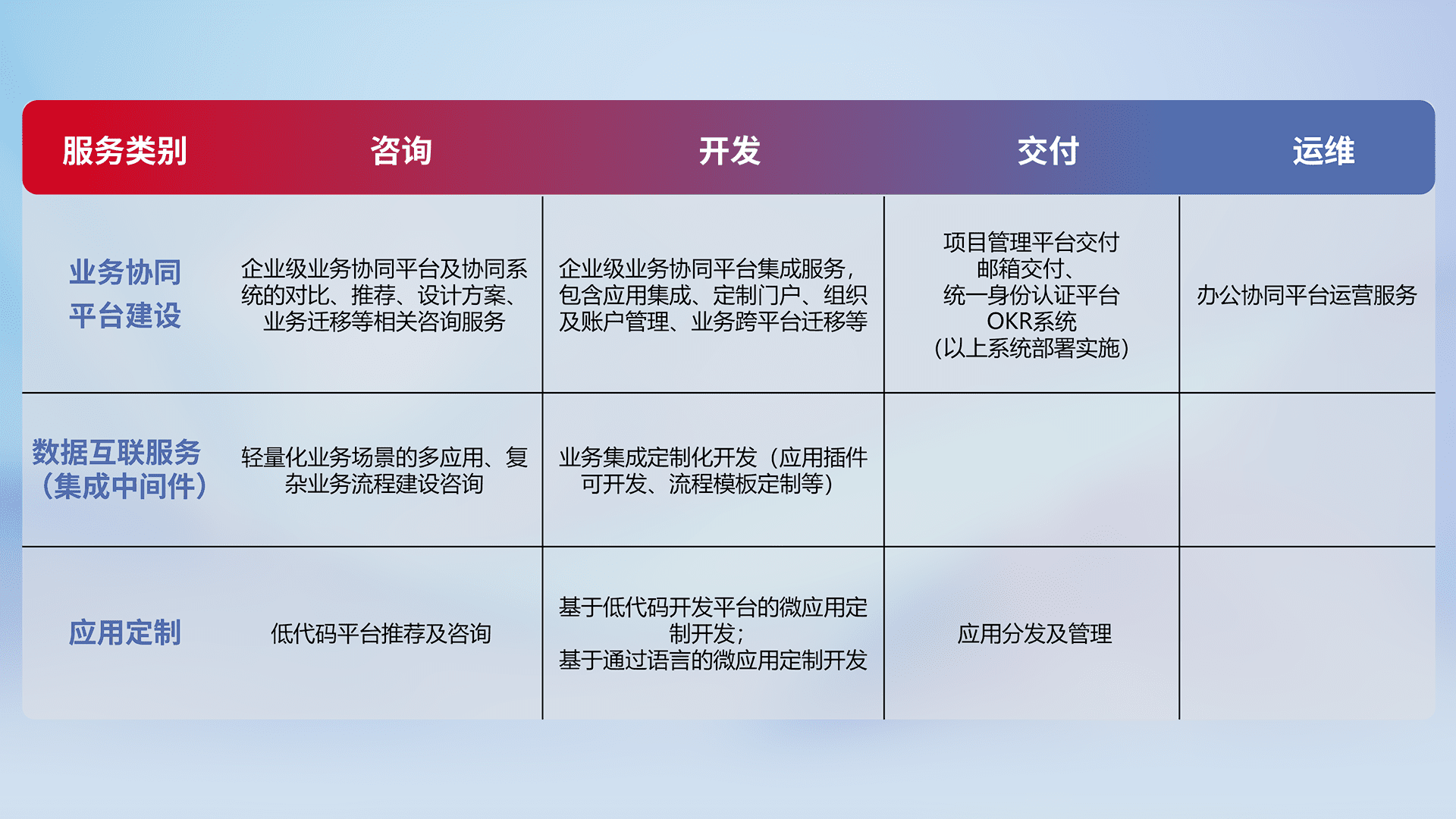 针对钉钉、、、、企微、、IDaas等平台级产品提供产品的规划、、、方案、、、、交付、、、、定制化开发等服务,,实现如统一协同办公、、智能客户服务、、、、混合会议管理、、智能数据查询、、、、等业务场景,,实现数字化转型。。。。